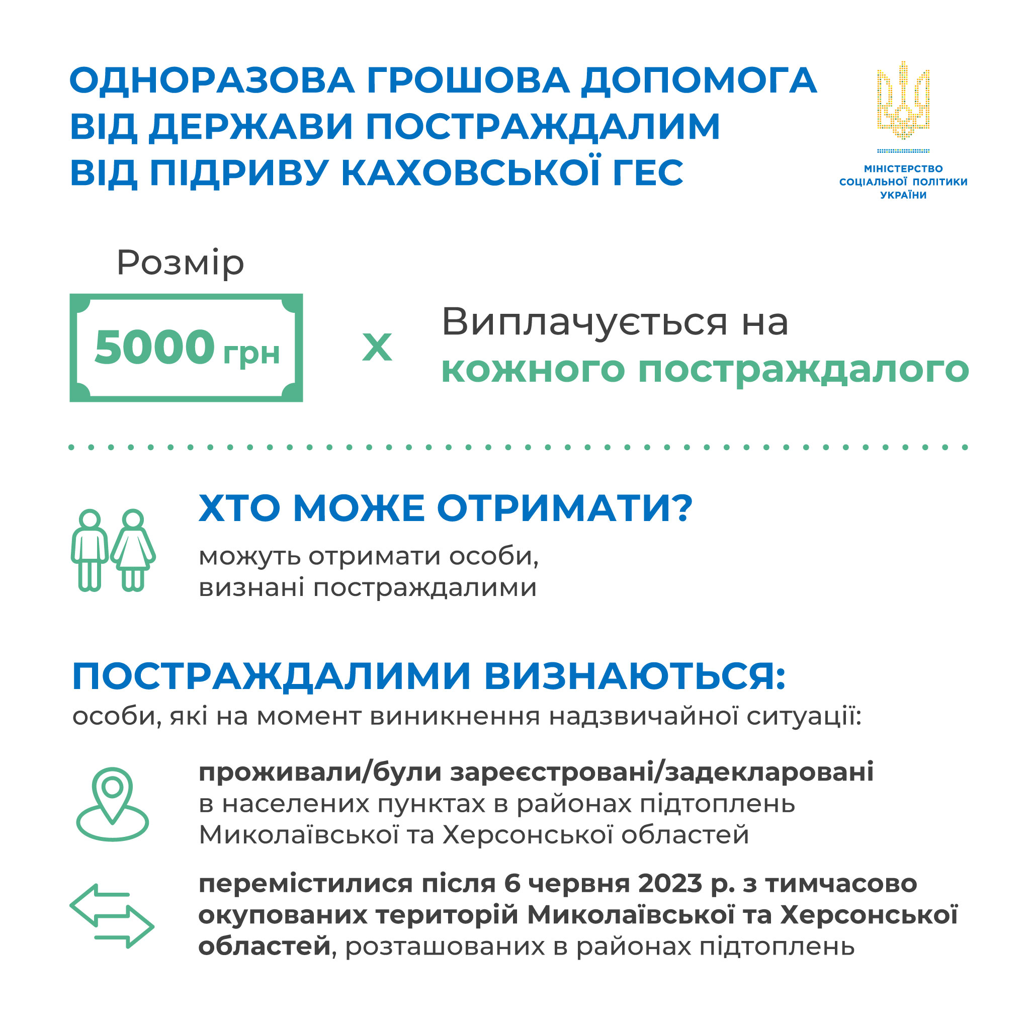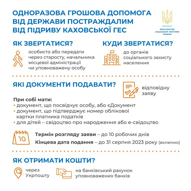 Кожен постраждалий внаслідок підриву росіянами Каховської ГЕС може отримати одноразову грошову допомогу від держави. Для цього Уряд 19 червня 2023 року прийняв постанову № 626, якою запровадив виплату у 2023 році Миколаївською та Херсонською обласними військовими адміністраціями за рахунок коштів резервного фонду державного бюджету одноразової матеріальної грошової допомоги постраждалому населенню внаслідок підриву Російською Федерацією греблі Каховської гідроелектростанції у розмірі 5000 гривень на одну особу, а також 07.07.2023 року Урядом було прийнято постанову Кабінету Міністрів України № 691 «Про внесення змін до Порядку надання одноразової матеріальної грошової допомоги постраждалому населенню внаслідок підриву російською федерацією греблі Каховської гідроелектростанції» відповідно до якої одноразова матеріальна грошова допомога надаватиметься незалежно від отримання допомоги на проживання ВПО.